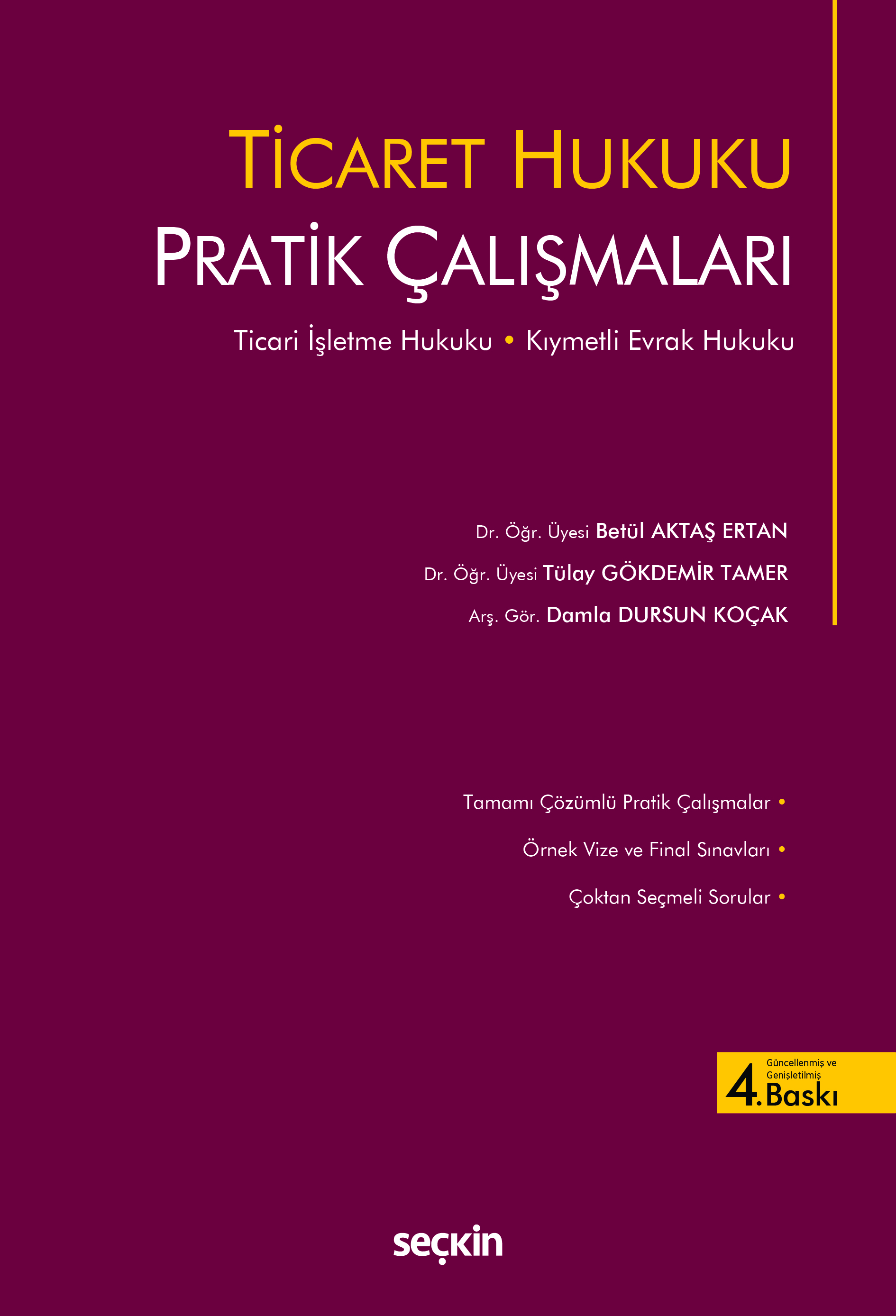 - Ticaret hukuku dersleri, hukuk fakültelerinde pratik çalışmalara ihtiyaç duyulan derslerin başında gelmektedir. Yazarların, Maltepe Üniversitesi Hukuk Fakültesi Anabilim Dalı olarak, ticari işletme hukuku ve kıymetli evrak hukuku derslerindeki çalışmalarından derledikleri kitabın birinci bölümü ticari işletme hukukuna, ikinci bölümü ise kıymetli evrak hukukuna ayrılmıştır.